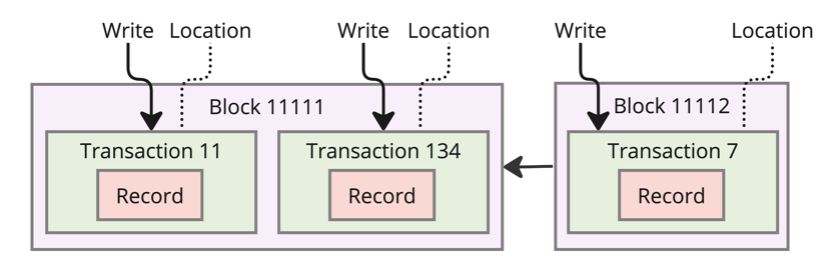 An independent record is written to the blockchain inside a transaction.