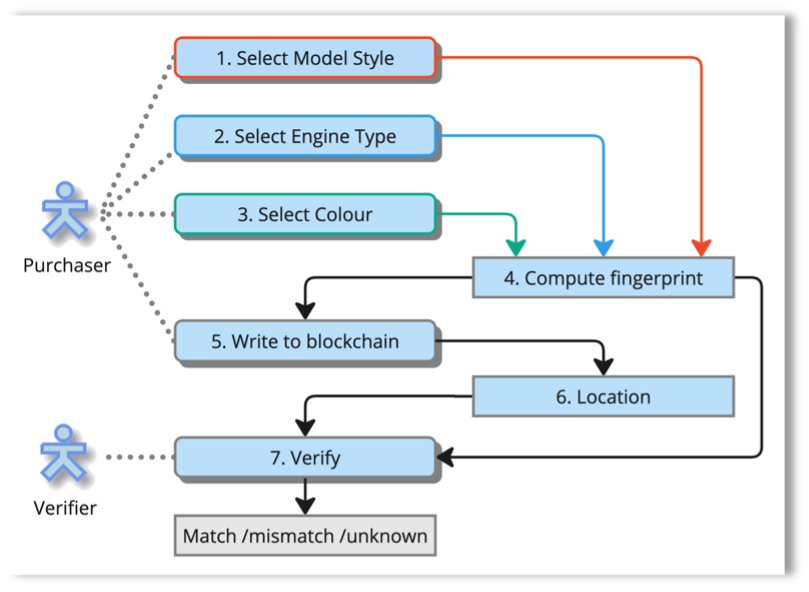 The expected result is that the car order matches what is on the blockchain. Or, an incorrect item (example: wrong colour) explicitly does not match what is on the blockchain.