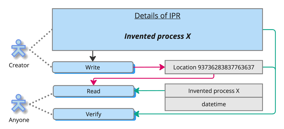 An Intellectual Property (IP) owner wants to record tamper-proof information about a new process they have invented, whilst also providing transparency and proof of publishing for future revenue streams.