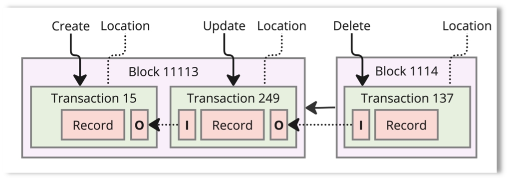 Records are linked together using transaction outputs and inputs. The latest location of the linked locations is either available to extend the linked records (has an unused output) or is terminated (has no unused outputs).