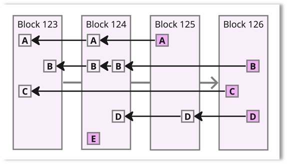 Linked records A was not updated in the latest block Linked records B was not updated in the previous block Linked records C was not updated for several blocks Linked records E has not been updated at all yet
