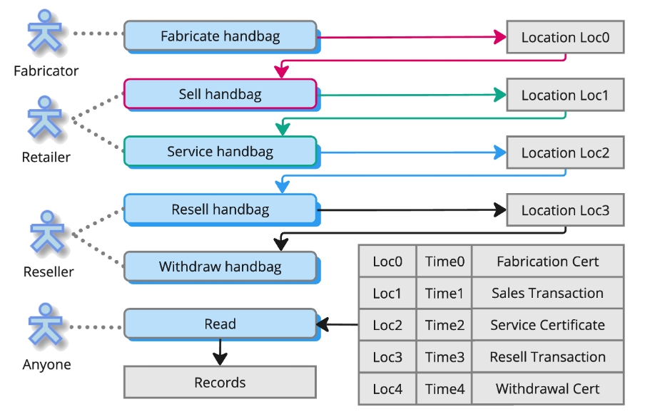 An informal consortium of arbitrary businesses comprising a luxury goods fabricator, a retailer and service shop and a reseller co-operate over the life of a luxury handbag.