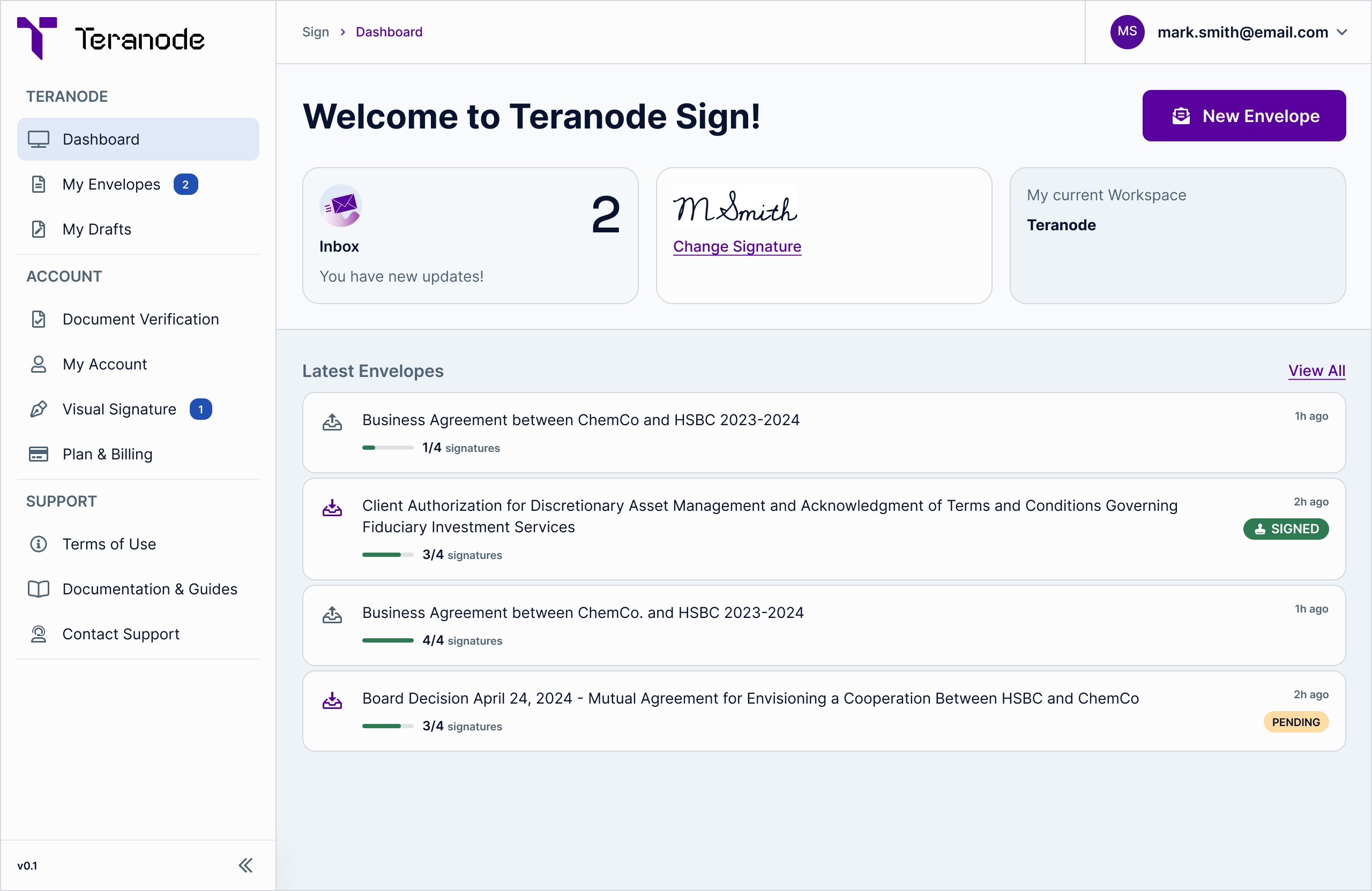 Teranode Sign offers a dashboard that allows you to easily manage your incoming and outgoing digital signing transactions - Envelopes - in one place. It provides an at-a-glance view of the envelopes with documents that require your signature and those that have been sent for signing.\