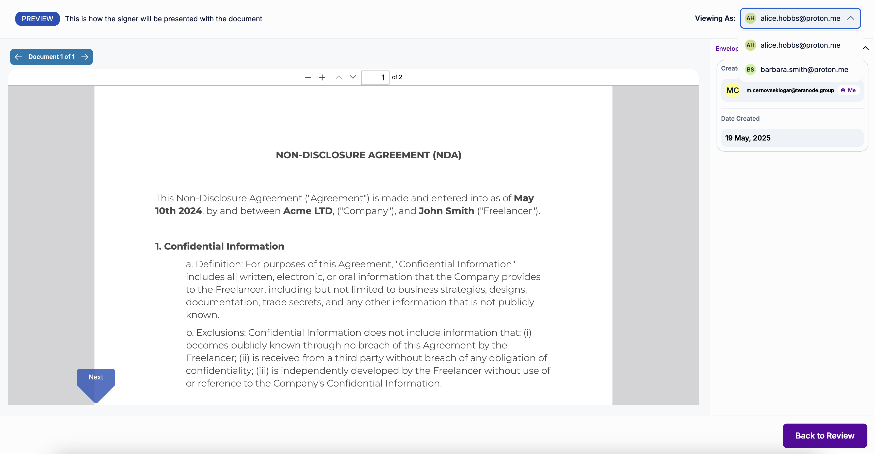 You can switch through different recipient views by clicking on the top right drop-down. This will show you exactly how a certain recipient will see the documents within the envelope.