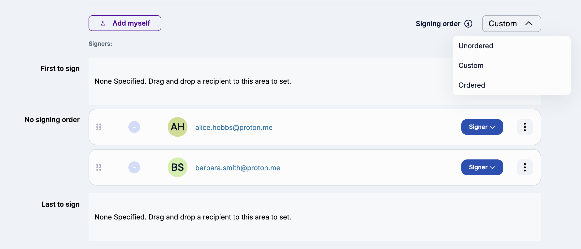The Enforce Signing Order feature allows you to manage the sequence in which the recipients should add their signature to documents sent for signing. You can change the signing order by simply clicking and dragging the assigned signers and placing them according to their position in the signing request.