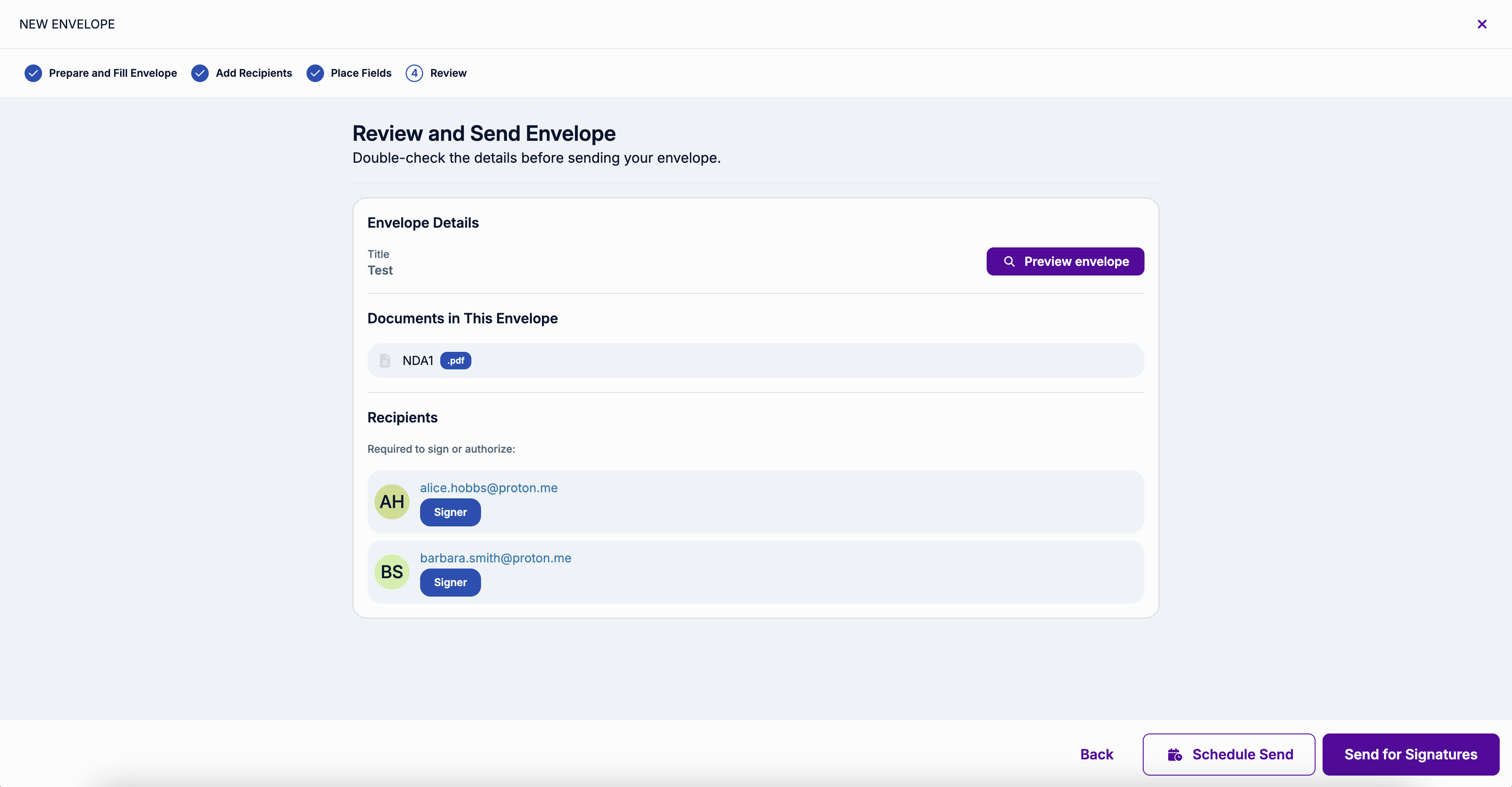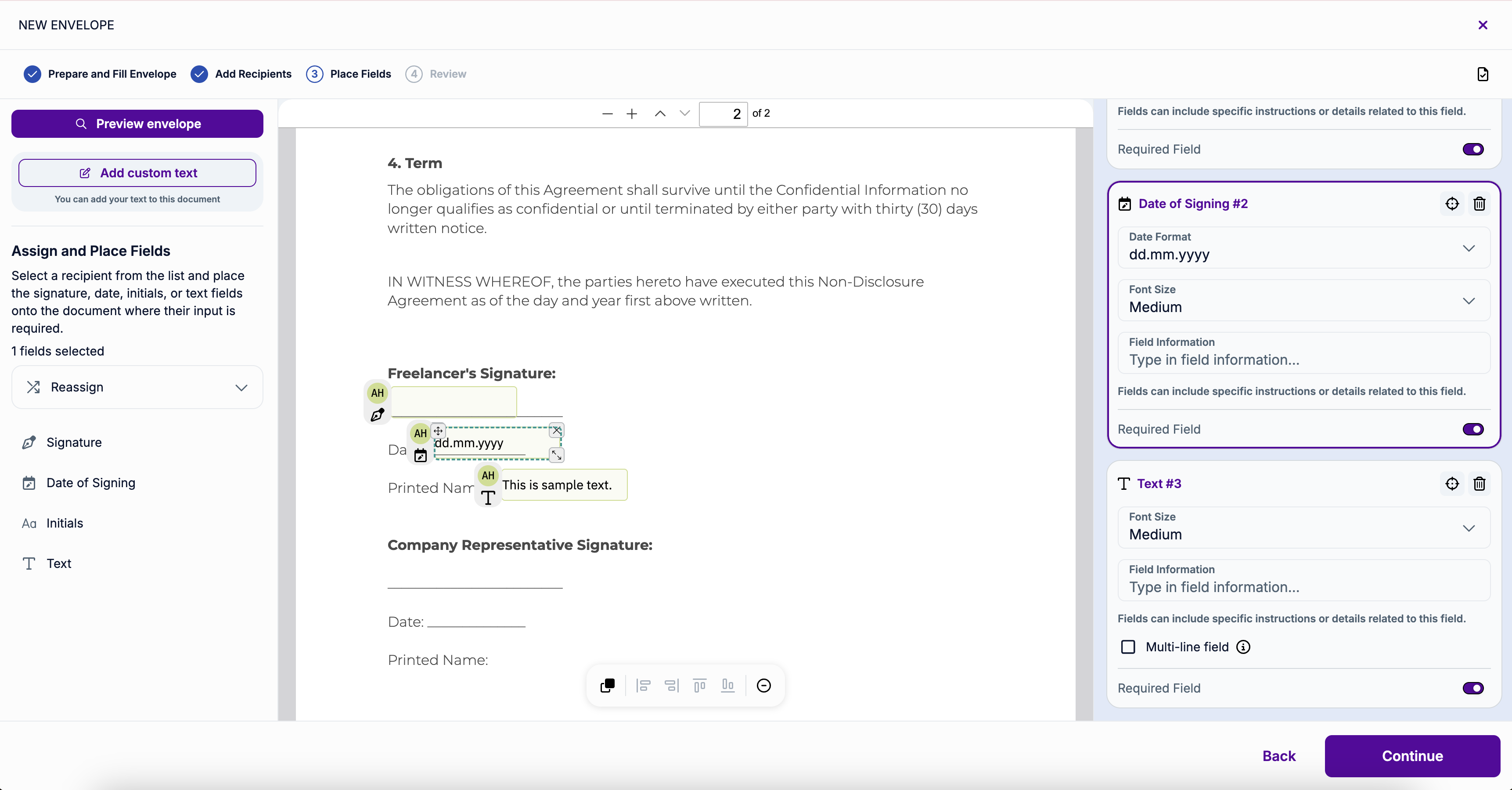 In this step, you also have the option to Preview the envelope. It will open a document preview, where you can check if all the fields are placed correctly.