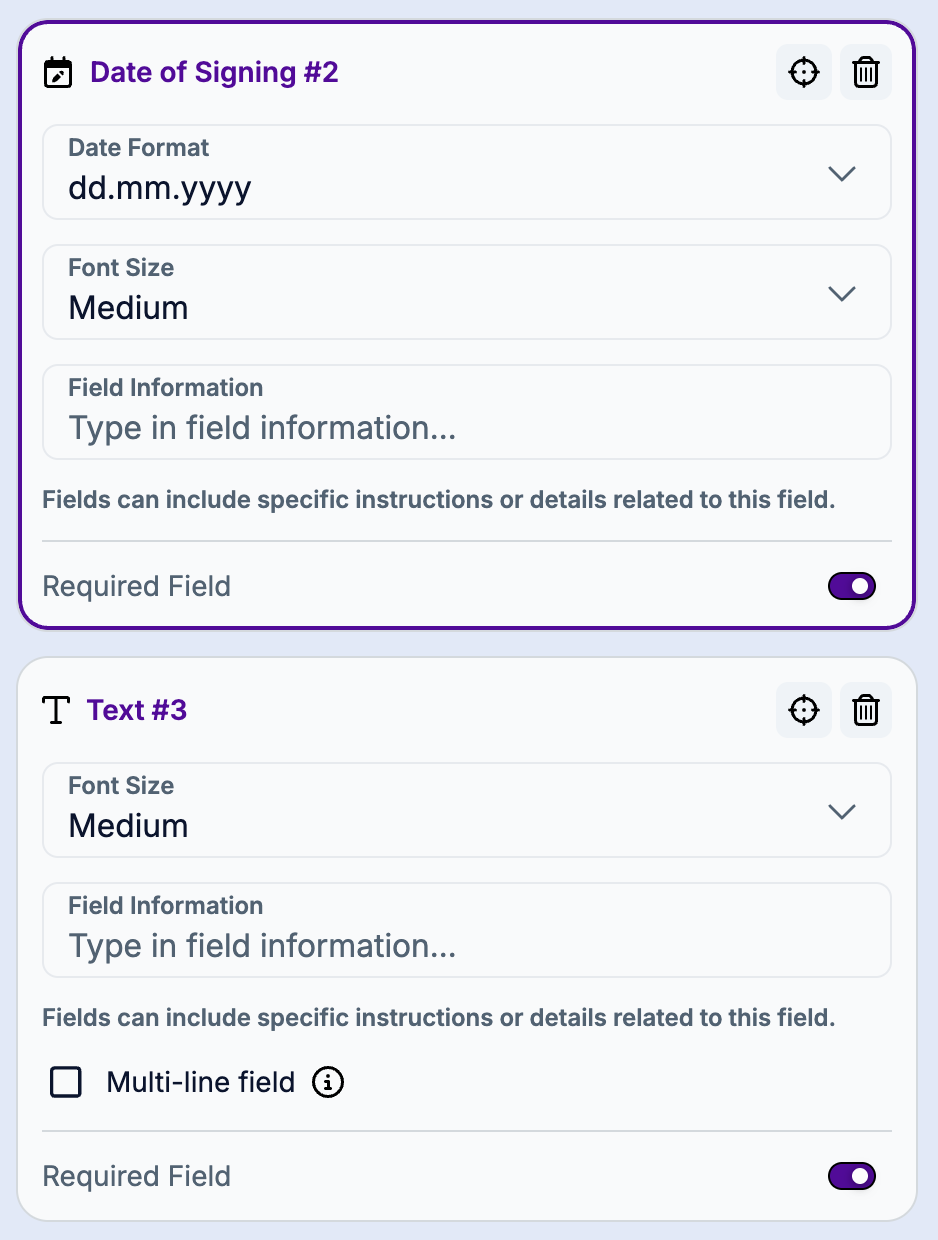For each field, you can specify whether it is required or not. You can also add help text to each field to guide each Signer individually.