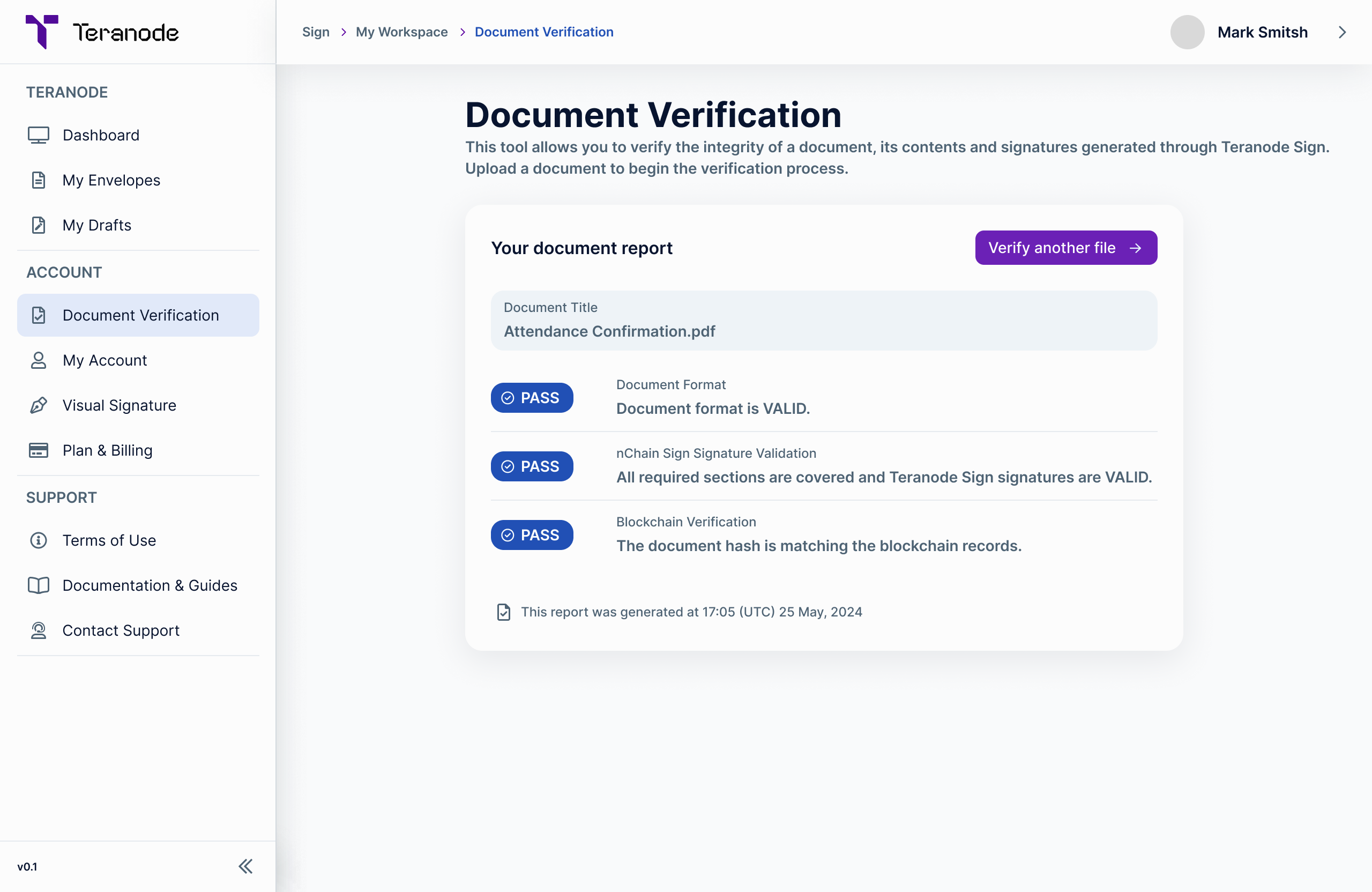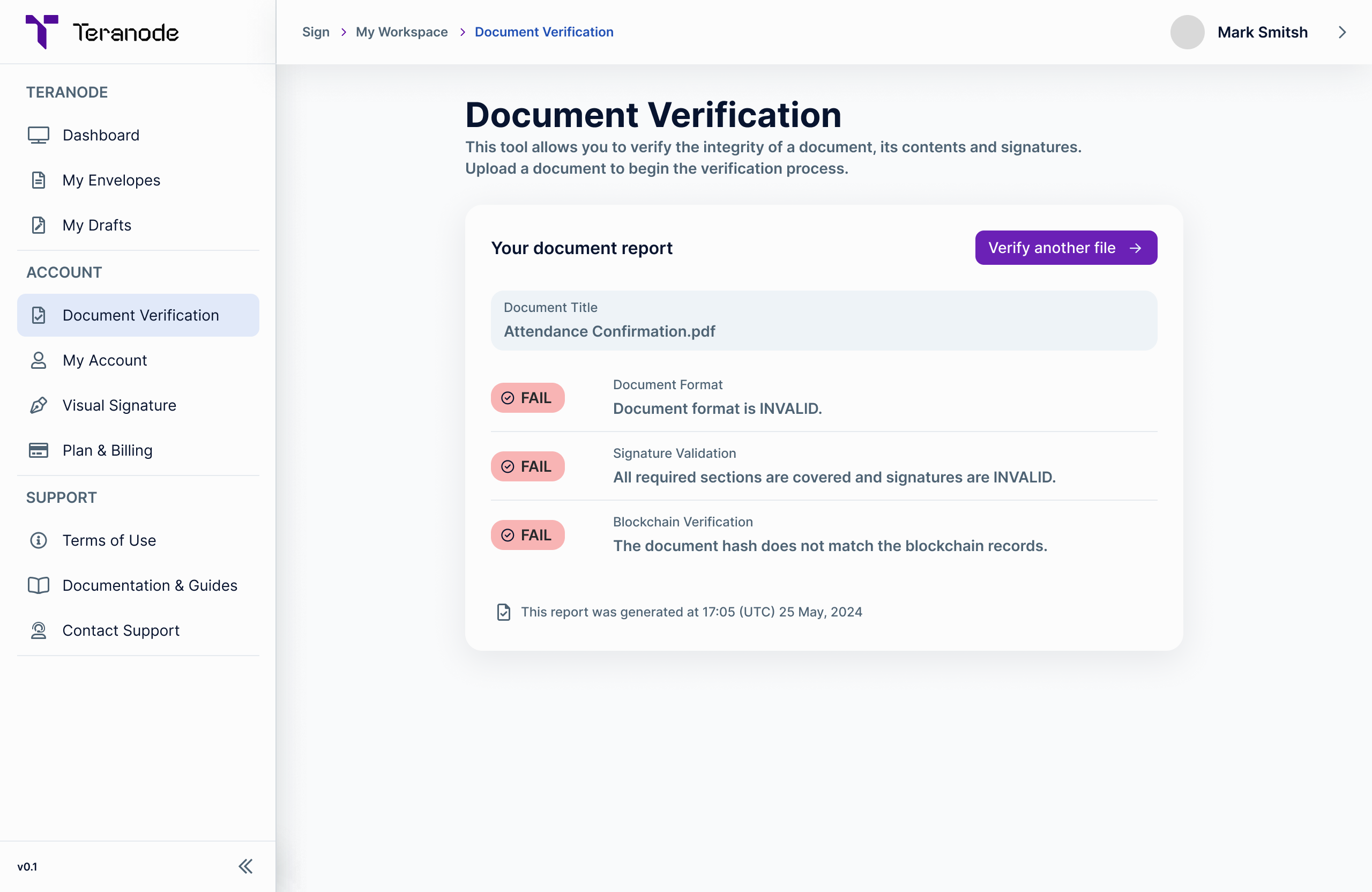 The tool verifies the uploaded document and generates a verification report indicating the document’s status.